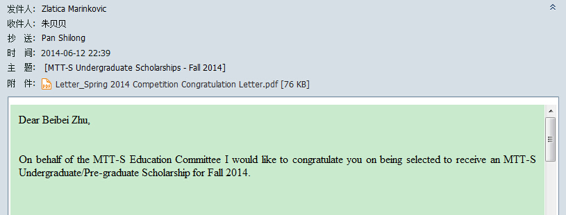 朱贝贝同学获得IEEE MTT-S秋季本科生/研究生奖学金