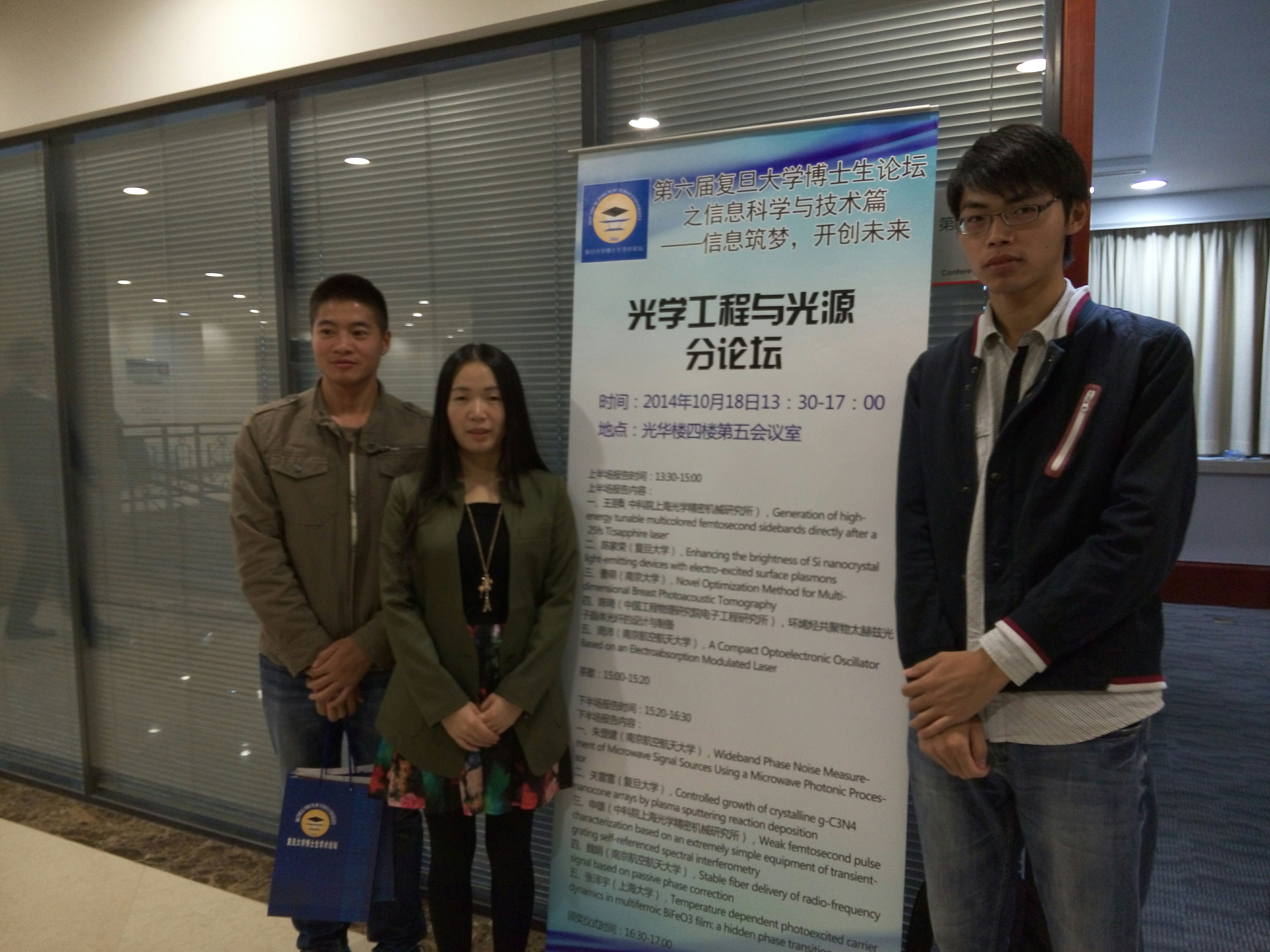 10月18日,微波光子学实验室三名研究生魏娟、周沛、朱登建赴上海参加了第六届复旦大学博士生论坛,参与该论坛的研究生主要来自复旦大学、南京大学、东南大学、华中科技大学等国内著名高校。三位同学分别就射频信号稳相传输、小型化光电振荡器和宽带相噪测量三个主题做了报告。经评委老师评审,本实验室获得了一项一等奖(魏娟)和两项二等奖(周沛、朱登建)。