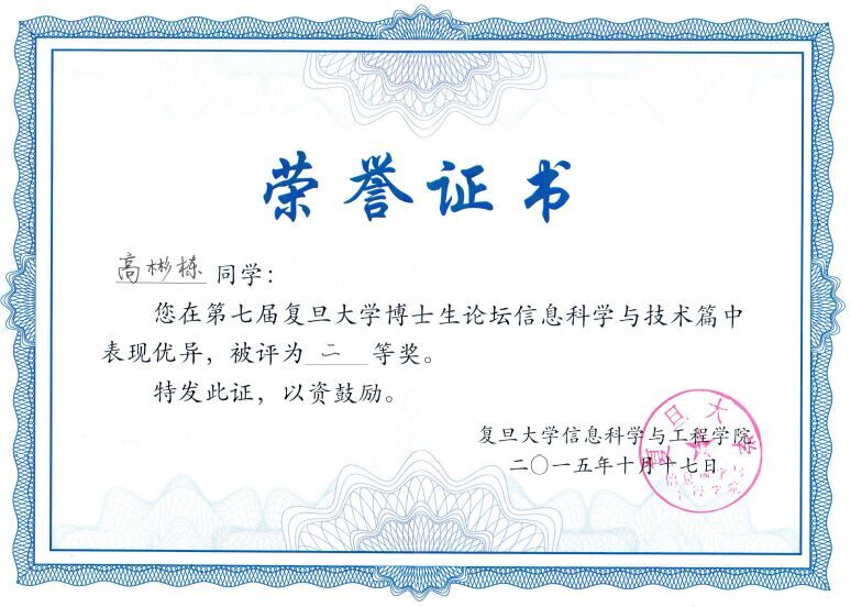 2015年10月17日,第七届复旦大学博士生论坛信息科学与技术篇在复旦大学光华楼举办。本次论坛有来自全国十几所高校、研究所100余篇论文投稿,本实验室2015届博士生高彬栋表现优异,获得本次博士生论坛二等奖。