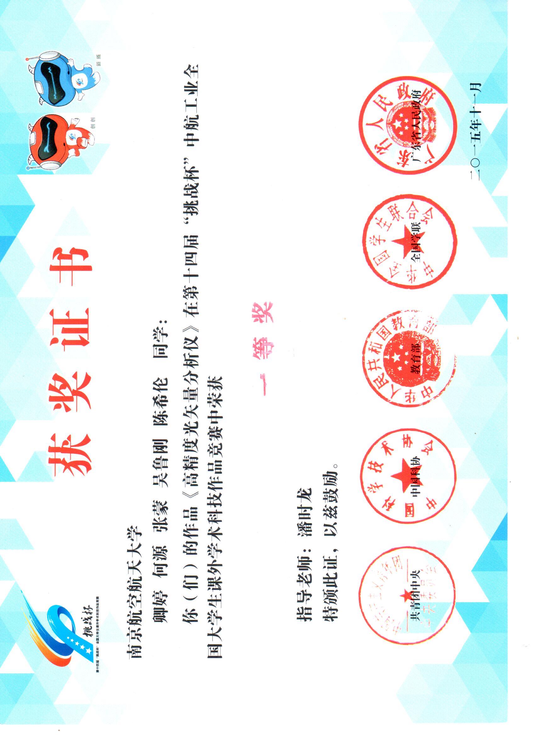 2015年11月,实验室卿婷、何源、张蒙、陈希伦和吴鲁刚同学组成的团队获得“挑战杯”全国大学生课外学术科技作品竞赛(以下简称“‘挑战杯’竞赛”)全国一等奖,题目为“高精度光矢量分析仪”,潘时龙教授被评为优秀指导教师。 “挑战杯”是由共青团中央、中国科协、教育部、全国学联和地方政府共同主办,国内著名大学、新闻媒体联合发起的一项具有导向性、示范性和群众性的全国竞赛活动。 自1989年首届竞赛举办以来,“挑战杯”竞赛始终坚持“崇尚科学、追求真知、勤奋学习、锐意创新、迎接挑战”的宗旨,在促进青年创新人才成长、深化高校素质教育、推动经济社会发展等方面发挥了积极作用,在广大高校乃至社会上产生了广泛而良好的影响,被誉为当代大学生科技创新的“奥林匹克”盛会。 |