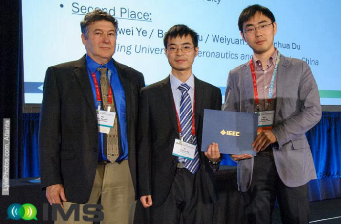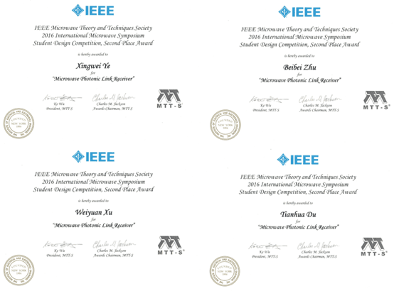美国旧金山当地时间2016年5月24日,IEEE 微波理论与技术学会(MTT-S)一年一度的学生设计大赛在国际微波会议(IMS,International microwave symposium)上举行。我校代表队(参赛选手叶星炜、朱贝贝、徐威远、杜天华等,指导老师:潘时龙教授)斩获了微波光子链路接收机(microwave photonic link receiver)项目的第二名。这是本实验室在IEEE MTT-S学生设计大赛上获得的第二个奖项。 IEEE MTT-S学生设计大赛自2005年举行以来,参与人数逐年增加,影响范围越来越广。到2016年,比赛项目已达到13项,涉及到17个微波技术领域,是微波领域最具影响力的国际大赛。 |