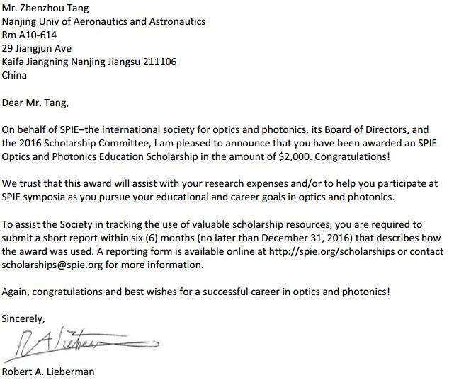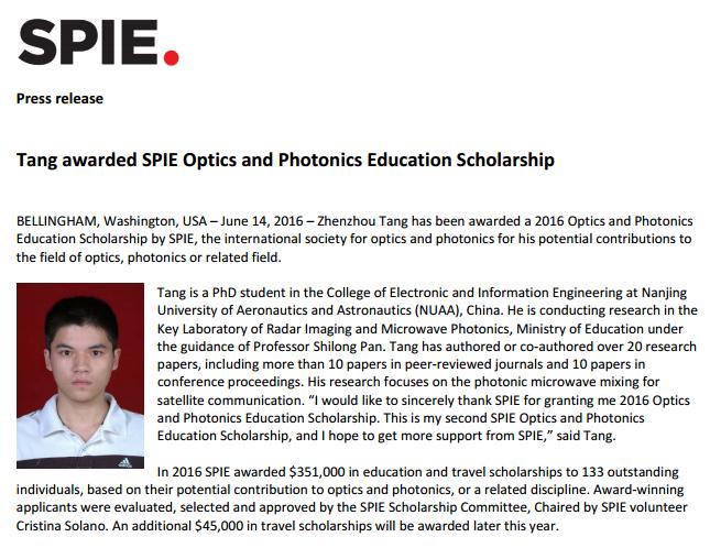 近日,微波光子学实验室2015级博士研究生唐震宙同学获得了2016年度国际光学工程学会光学与光子学教育奖学金 (SPIE Optics & Photonics Education Scholarship)。除颁发获奖证书外,SPIE还提供2000美元。这是唐震宙同学第二次获得SPIE Optics & Photonics Education Scholarship,也是本实验室成立以来第四次获得该奖项。 |