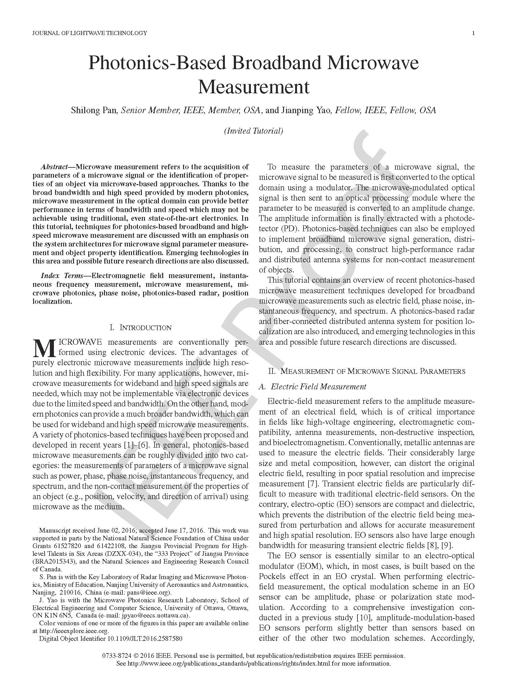 在光子领域权威期刊IEEE/OSA Journal of Lightwave Technology (JLT)的邀请下,本课题组撰写了题为Photonics-based Broadband Microwave Measurement的Invited Tutorial,目前已在该期刊在线发表。 JLT的Invited Tutorial是光子学领域极高的荣誉,表明本课题组在微波光子宽带测量方向形成了重要影响。在JLT历史上,只有极少数大陆学者受邀发表Tutorial论文。该论文的链接为http://ieeexplore.ieee.org/xpl/articleDetails.jsp?arnumber=7505899,目前可免费下载阅读。 |