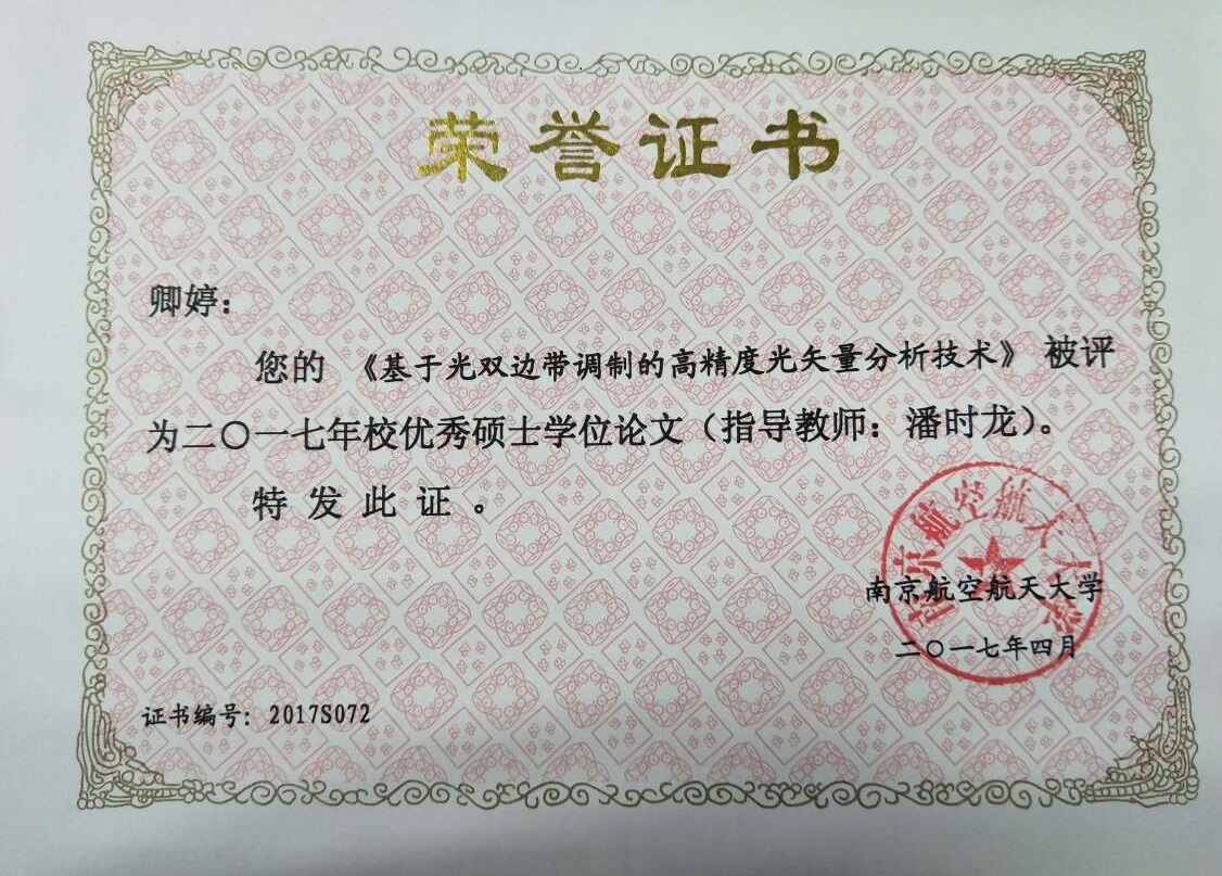 根据《南京航空航天大学优秀博士、硕士学位论文评选实施办法》(校研字[2005]41号)的有关规定,经本人申请,答辩委员会推荐,学院学位评定委员会初选,校专家评审会评审,校学位评定委员会审定,确定了155名硕士研究生的硕士学位论文为“2017年校优秀硕士学位论文”。本实验室卿婷同学的硕士学位论文《基于光双边带调制的高精度光矢量分析技术》(指导教师:潘时龙)成功入选。