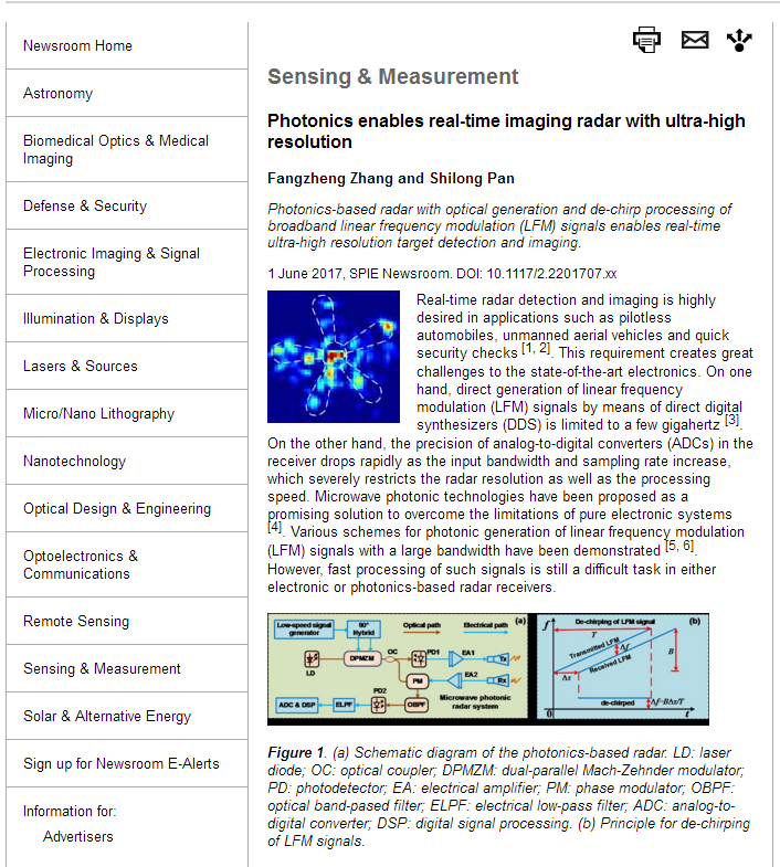 应国际光学工程学会(SPIE)刊物SPIE Newsroom的邀请,南航微波光子学实验室张方正副教授和潘时龙教授撰文介绍了本实验室在高精度微波光子视频成像雷达领域的最新研究进展。 日前,该论文“Photonics enables real-time imaging radar with ultra-high resolution”在SPIE Newsroom上在线发表。文中提出了一种基于微波光子技术的高精度实时成像雷达。该雷达系统中采用微波光子信号产生技术获得宽带线性调频信号,并通过微波光子混频技术对回波信号进行去斜处理,解决了微波雷达带宽较低,处理速度较慢的问题,最终实现了高分辨率实时成像。文中还演示了利用该雷达对风扇等物体的实时成像效果。(详情请点击:http://spie.org/newsroom/zhang-photonics-enables-real-time-imaging-radar-with-ultra-high-resolution?ArticleID=x126850&SSO=1) 微波成像雷达面临着成像精度差、处理速度慢以及实时性差等技术瓶颈,难以在民用产品中的广泛应用。采用微波光子技术进行雷达信号产生和处理,可以突破上述瓶颈,提高雷达的成像精度和处理速度,从而实现高精度的实时雷达成像。微波光子实时成像雷达不仅在国防军事领域具有应用价值,更在自动驾驶汽车,无人机和自主机器人等民用领域具有巨大的应用潜力。南航微波光子学实验室作为雷达成像与微波光子学教育部重点实验室的重要组成部分,积极开展微波光子雷达的相关研究,取得了多项进展,相应的研究成果已经发表在Optics Express和IEEE Photonics Technology Letters等国际期刊上。 Tips: SPIE Newsroom是由国际光学工程学会于2006年创立的技术新闻类网上刊物,主要报道国际光学工程领域的重要研究成果,加强此类成果的推广、传播,希望促进不同学科之间的交叉、融合。该刊物设有13个专题:天文学、生物医学光学与医学成像、安全与防护、电子成像与信号处理、显示与照明、激光器与光源、微纳光刻技术、纳米技术、光学设计及工程、光电通信、遥感、传感与测量、太阳能及替代能源等。刊登的文章均由相关领域专家推荐约稿。
