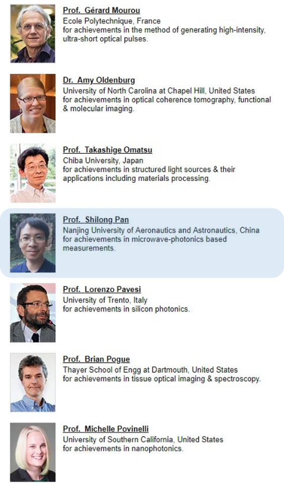 近日,国际光学工程学会(SPIE)公布了2019年学会会士(SPIE Fellow)遴选名单,本实验室潘时龙教授成功入选。 国际光学工程学会(SPIE)成立于1955年,是致力于光学、光子学和电子学领域的研究、工程和应用的著名专业协会。SPIE拥有遍布世界各地的会员约50000名,是光学工程领域最具权威的专业组织之一,每年在奖学金、研究基金和科技教育及创新活动方面投资超过90万美元,其主要任务包括向会员及国际工程科学界提供信息、教育产品及服务,为光学及光子学领域的交流及其与其他领域的互动提供平台,针对新兴技术组织会议及教育项目等。 每年,SPIE在全世界范围内遴选出少量杰出的光学科学家作为其会士。成为SPIE会士,需经过多名资深学者的提名和严格选拔,并在光学、光电子、图像等领域做出卓越的科技贡献。潘时龙教授此次当选是SPIE对其在微波光子测量方面所获成绩的高度认可。同期入选的有2018年诺贝尔物理学奖获得者美国科学家Arthur Ashkin、法国科学家Gérard Mourou、加拿大科学家Donna Strickland,以及中国光学学会主席龚旗煌院士等著名科学家。 潘时龙教授现为南京航空航天大学信息光电子工程研究所所长,曾入选IET Fellow、“万人计划”科技创新领军人才。 新闻链接:https://spie.org/membership/explore-membership/fellows?SSO=1 |