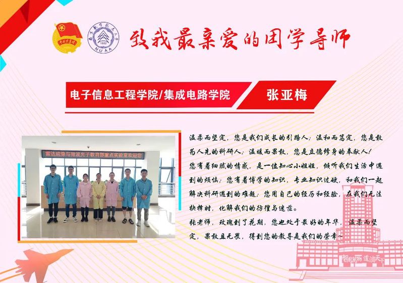 近日,南京航空航天大学公布了学生们最喜爱的“团学导师”,我室张亚梅老师喜获殊荣,这是继去年王祥传老师后又一位老师获得此表彰!