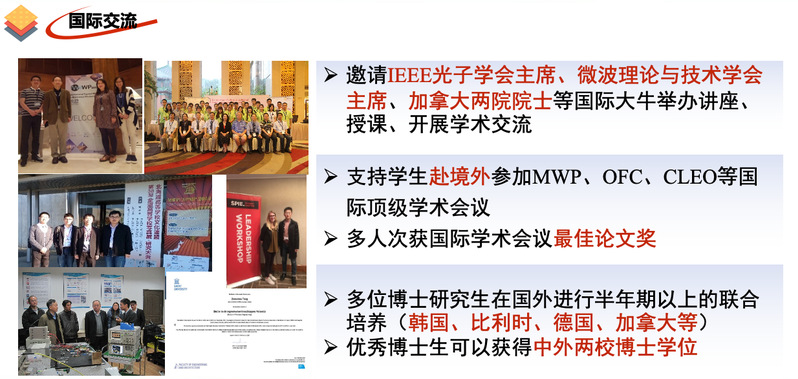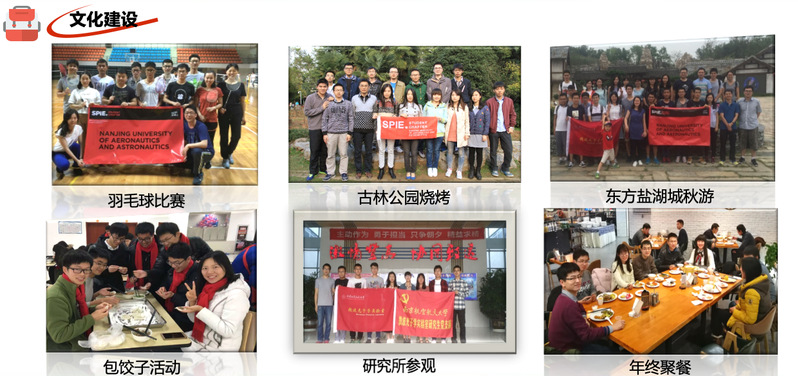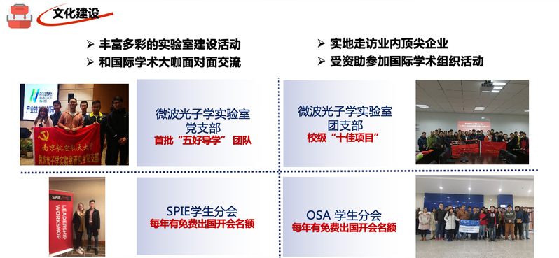实验室不仅科技成果众多,文化建设也从不忽视。实验室建有包括微波光子学实验室党支部、微波光子学实验室团支部、SPIE学生分会、OSA学生分会在内的四个学生组织,组织了众多丰富多彩的活动,例如与国际大咖面对面交流、实地走访业内顶尖企业、受资助参加学术组织活动等等。同时,实验室注重同学们的全面发展,学习之余,大家相约户外,进行运动、聚会、旅游参观等活动,同学们一起生活、一起学习、一起成长为科研英才。