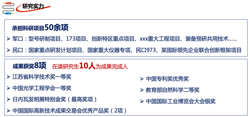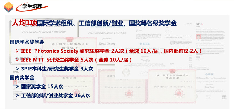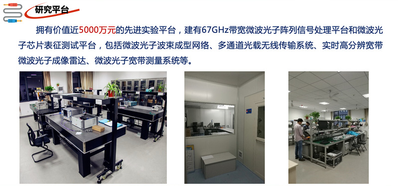 拥有价值近5000万元的先进实验平台,5间实验室+3间学生工作室+苏州研究院,建有67GHz带宽微波光子阵列信号处理平台和微波光子芯片表征测试平台,包括微波光子波束成型网络、多通道光载无线传输系统、实时高分辨宽带微波光子成像雷达、微波光子宽带测量系统等。