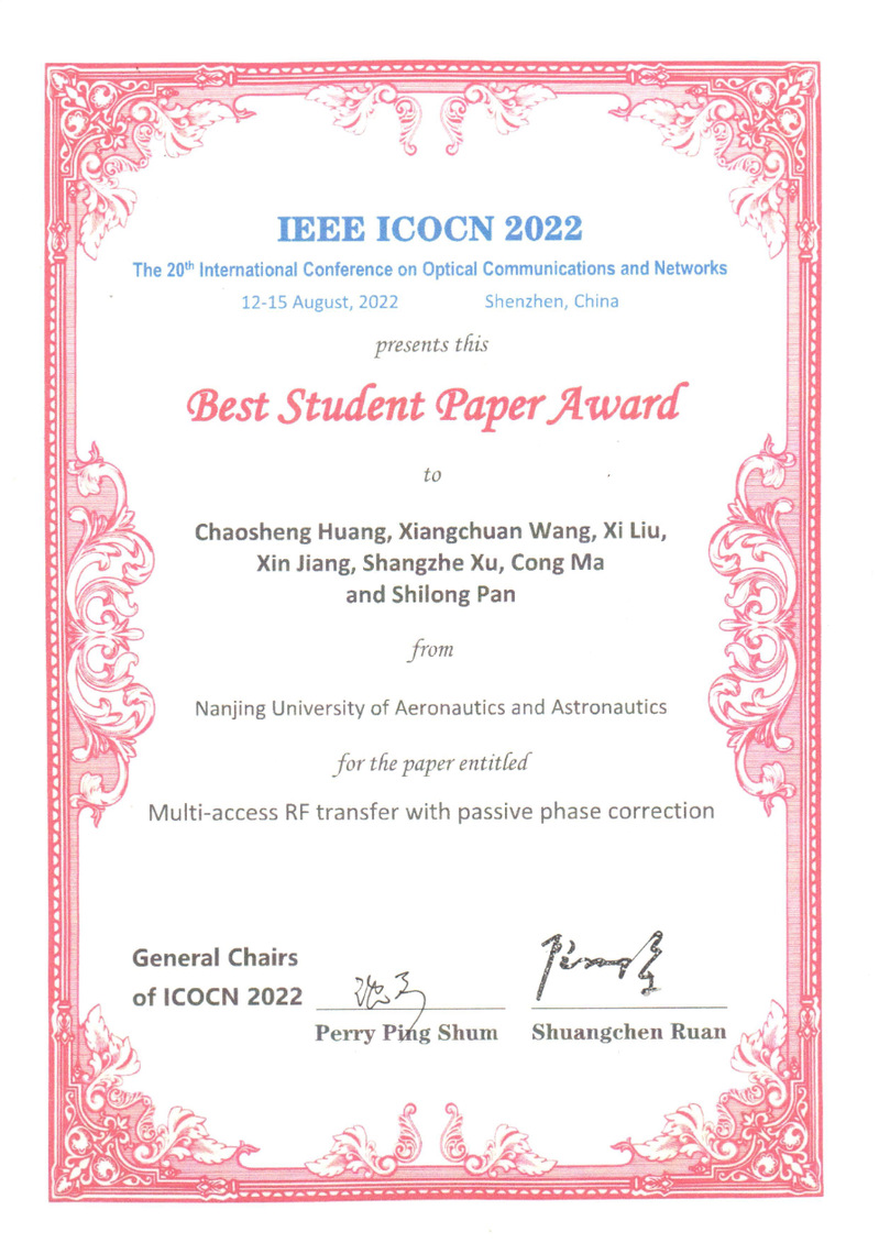 近日,2022国际光通信和网络会议公布了此次会议的论文评选结果,实验室黄朝晟同学经过专家评审,最终获得大会最佳学生论文奖。黄朝晟在论文中提出了一种多节点射频信号稳相传输方法,基于无源相位校正,在远端节点获得相位稳定的信号,并通过实验搭建多节点射频信号稳相传输系统,成功实现了相位抖动的有效校正。