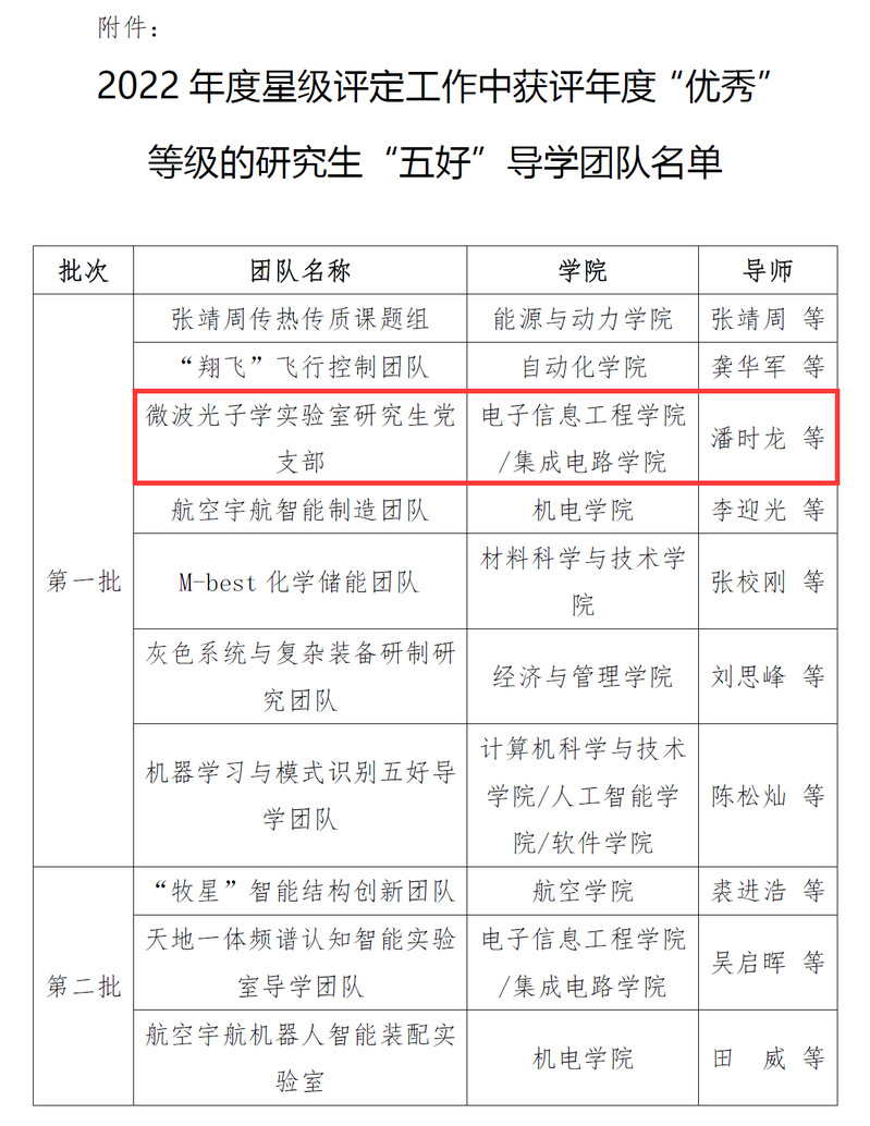 近日,在南京航空航天大学开展的2022年度研究生“五好”导学团队星级评定工作中,微波光子学实验室研究生党支部作为学校第一批“五好”导学团队,在此次评定工作中获评年度“优秀”等级。