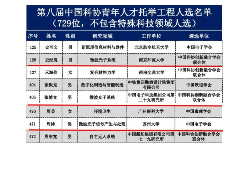 日前,中国科学技术协会公布了第八届中国科协青年人才托举工程的名单,微波光子学实验室培养的周沛博士(现就职于苏州大学)、张博文博士(现就职于中电29所)和史经展博士(现就职于南京师范大学)成功入选。目前,实验室师生累计入选全国青托已经7人。